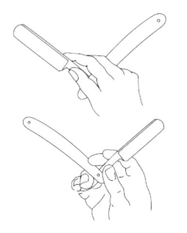Die folgende Zeichnung ist der grundlegende Griff zum Halten des Rasiermessers. Beim Rasieren des Nackenbereichs und des Kinns muss der Rasierer anders gehalten werden.
