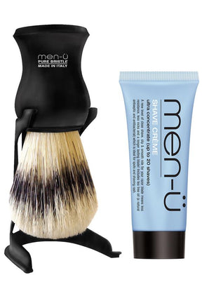 Uitstekende scheerkwast van varkenshaar van Italiaanse makelij met bijpassende scheerkwasthouder en een tube Men-Ü scheercrème van 15ml.
